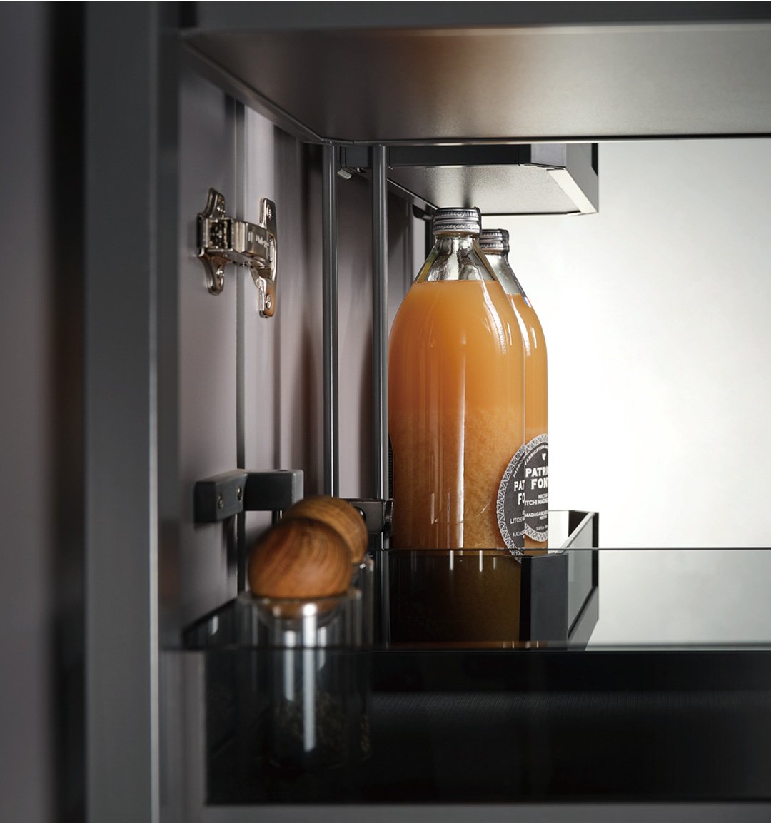 •جوانب زجاج شفافة تسهّل رؤية المنتجات وتضيف إحساس بالفخامة داخل المطبخ.