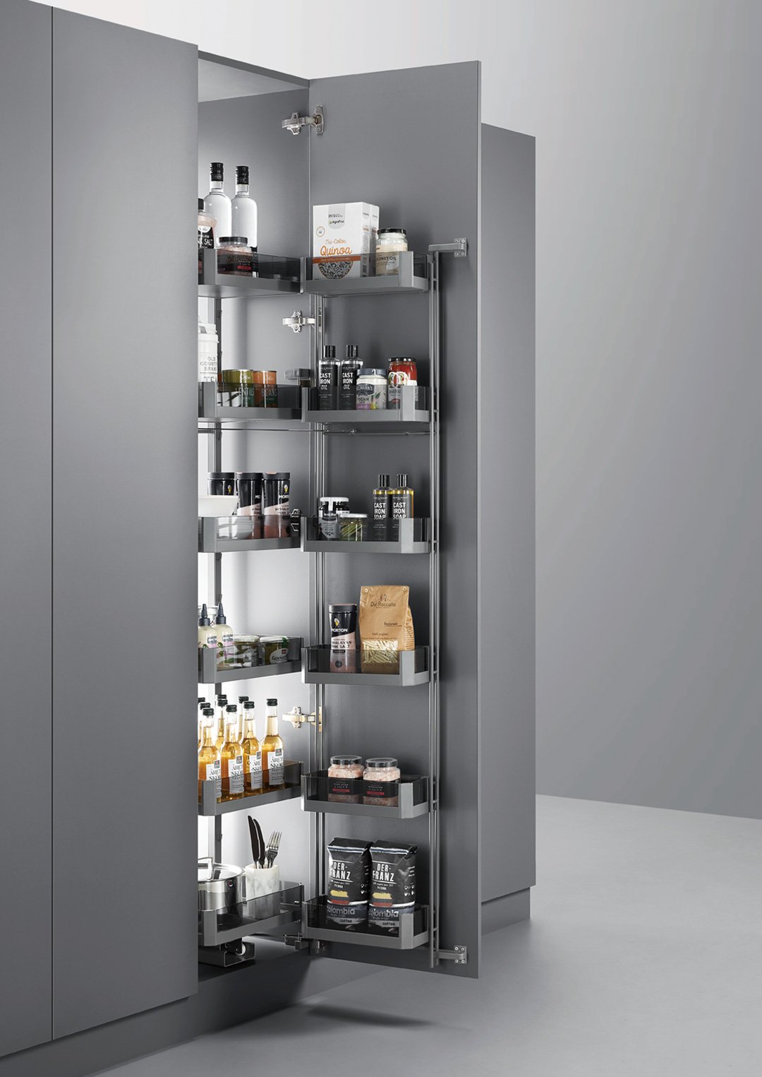 يعمل بنظام سحب كامل مع Soft Close لإغلاق ناعم وهادئ، ويحوّل خزانة البانتري إلى وحدة تخزين منظّمة وسهلة الوصول.